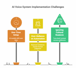 The biggest mistake is treating AI voice training as a one-time setup process. Brand voices evolve, markets change, and AI models drift over time. Successful implementations require ongoing training and refinement.