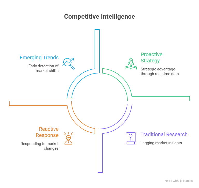 AI-powered market research extends beyond customer analysis to provide unprecedented competitive intelligence capabilities. Machine learning systems can monitor competitor pricing, product launches, marketing campaigns, and customer sentiment in real-time, providing strategic advantages that traditional research methods cannot match.