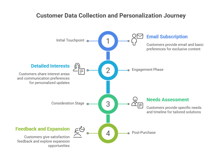 Start with low-friction data requests that provide immediate value to customers. A simple email subscription might unlock exclusive content or early access to sales. As the relationship develops, customers become more willing to share detailed preferences, purchase intentions, and feedback in exchange for increasingly personalized experiences.