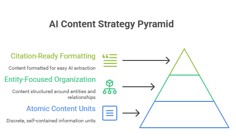 Atomic Content Units: Instead of creating comprehensive 3,000-word articles that cover broad topics, effective AI-era content breaks information into discrete, self-contained units. Each section should be able to stand alone as a complete answer to a specific query. This modular approach allows AI systems to extract and cite specific information without requiring users to consume entire articles.